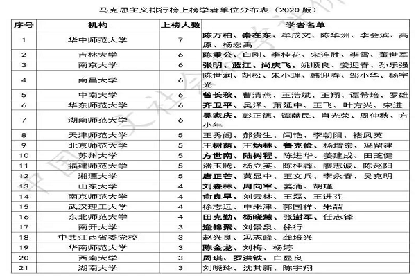 由中国人文社会科学评价研究中心(访问网址://evaluation.chd.edu.cn/)近日通过公众号推送的《中国哲学社会科学最有影响力学者排行榜:基于中文学术成果的评价(2020版)》简版“马克思主义学科”部分显示,我中心研究人员张国富教授(中心原主任)与孙金华教授同时成为最有影响力学者。我省仅有12名本学科专家荣登该排行榜(我省上榜学者数在全国28个排名地区中居第8名)。包括国家“双一流”重点建设大学郑州大学、国家小“211”工程重点建设大学河南大学与河南省社科院、中共河南省委党校等单位在内,全省仅有台湾av女优 与中共河南省委党校(薛瑞汉、将仁勇)、河南科技大学(苗贵山、张俊国)3家单位有两名入选专家的单位。在全国地方高校、党校与社科院等地方性社会科学研究机构等中有两名以上的单位60家(其中有2名专家入选的单位为25家)。此外,在全国入选167家单位中,中共中央党史研究室、中共中央文献研究室、《求是》杂志社、同济大学、上海大学、山西大学、中国浦东干部管理学院等权威研究机构或知名高校也仅有本学科两名专家入选。其中,孙金华、张国富教授在马克思主义、思想政治理论、中国共产党等3个二级学科中的马克思主义学科中分别排名第57名(总分676.40)、第76名(总分662.36)。