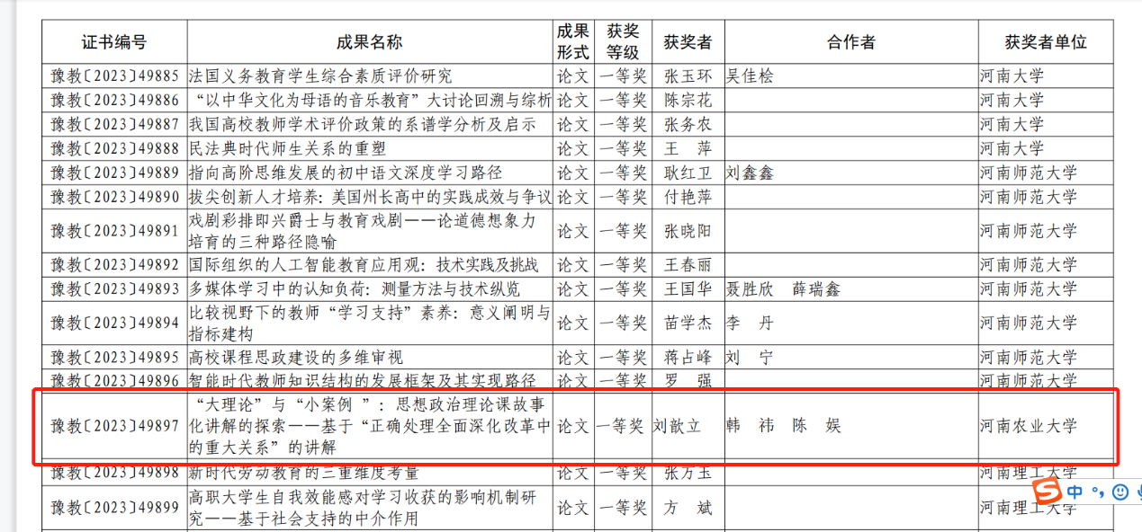 根据《河南省教育厅关于公布 2023 年度河南省教育科学研究优秀成果的通知》(教教科〔2023〕264号)精神,共确定2023年度河南省教育科学研究优秀成果912项,特等奖10项(其中台湾av女优