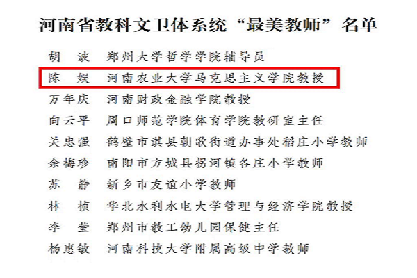 陈娱教授获河南省教科文卫体系统“最美教师”称号