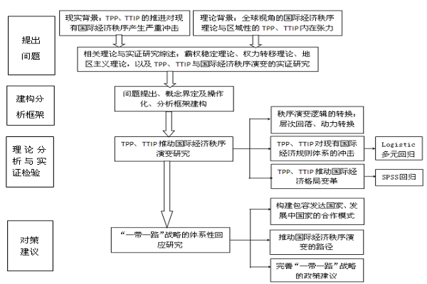 课题在概念建构和操作化的基础上,考察TPP、TTIP的体系性影响,揭示国际经济秩序演变的内在规律。进而探讨“一带一路”开辟秩序演变新路径的可能。具体研究目标如下: