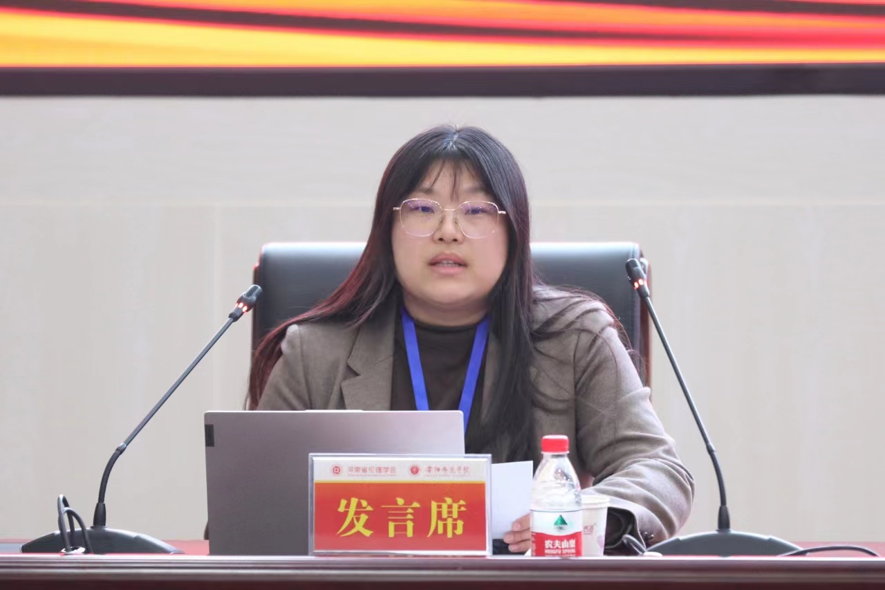在专题交流发言阶段,王蕊老师以《红旗渠精神融入高校思政课研究》为题,从红旗渠歌曲的角度分析其中蕴含的红旗渠精神。她指出红旗渠始建至今,全国各地的音乐工作者创作了很多不同类型的音乐作品来歌颂红旗渠。例如红旗渠竣工后,1971年中央新闻电影制片厂发行纪录影片《红旗渠》的主题曲《定叫山河换新装》,1972年《红旗渠凯歌震天响》,1975年《歌唱红旗渠》,2013年《红旗渠赞歌》,2018年《天河》,2021年《中国有条红旗渠》等。特别是2023年7月1日,周深发行的歌曲《如许》,从内容到旋律都给人以积极向上的力量,使更多青年人能够从红旗渠精神中汲取力量、接续奋斗。